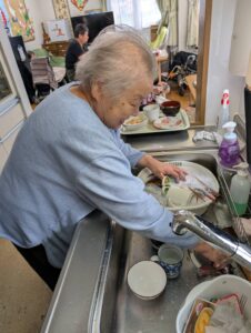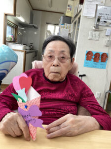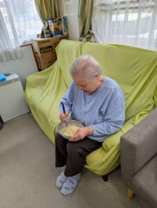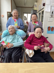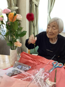 6月は町内会の方にフキをいただいたりしました。やはり売っている水煮よりも香りが強くて皆さん喜んで召し上がっていました。スタッフの手芸の作品を見て、みなさん喜ばれ、白無垢の衣装から、皆さんの結婚式の時の話などを聞くことができました。